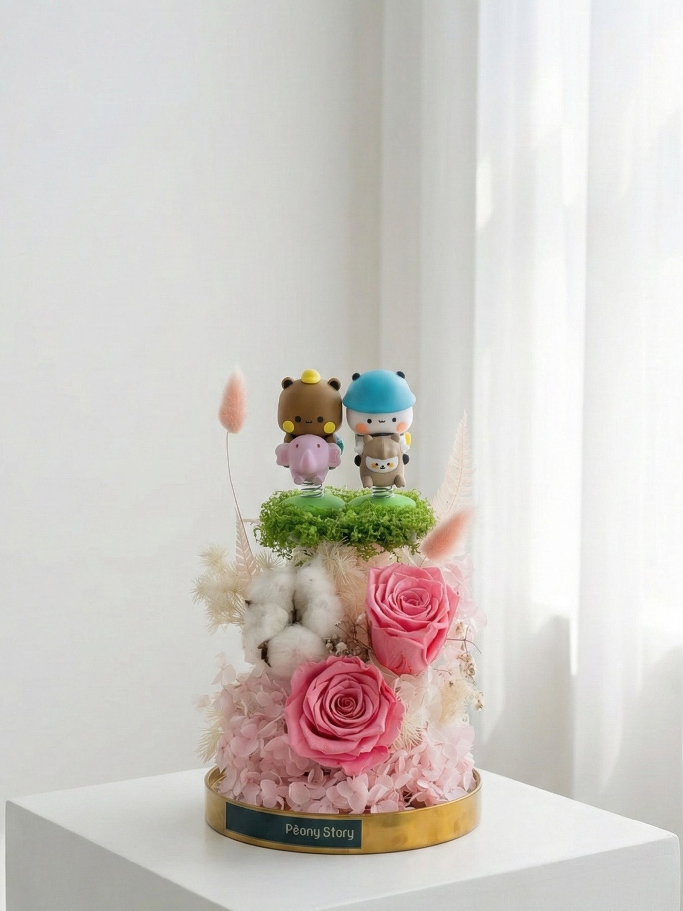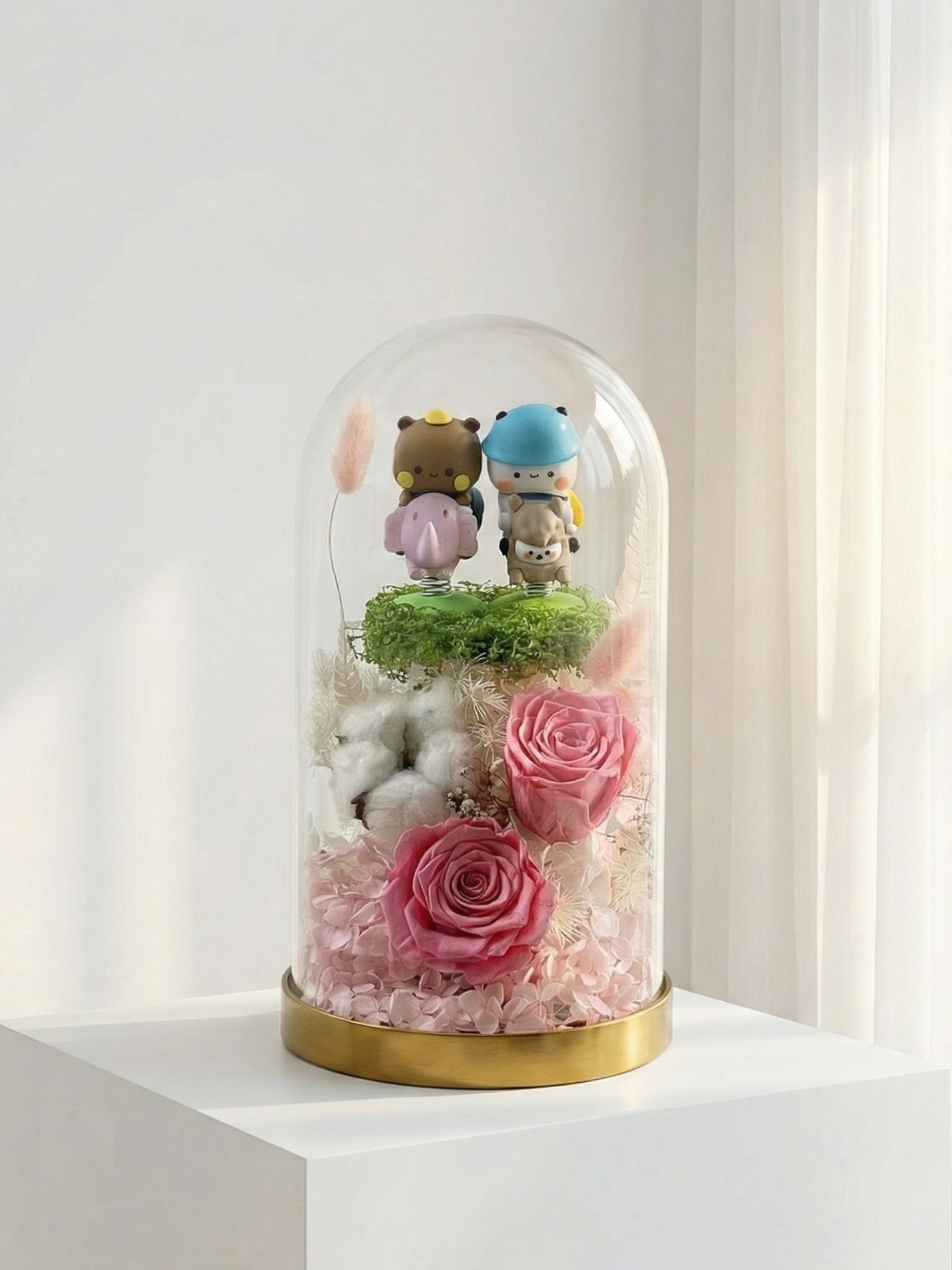 Dome berukuran large dengan figurine Bubu Dudu, dihias dengan rose preserved dan bunga kering lainnya.