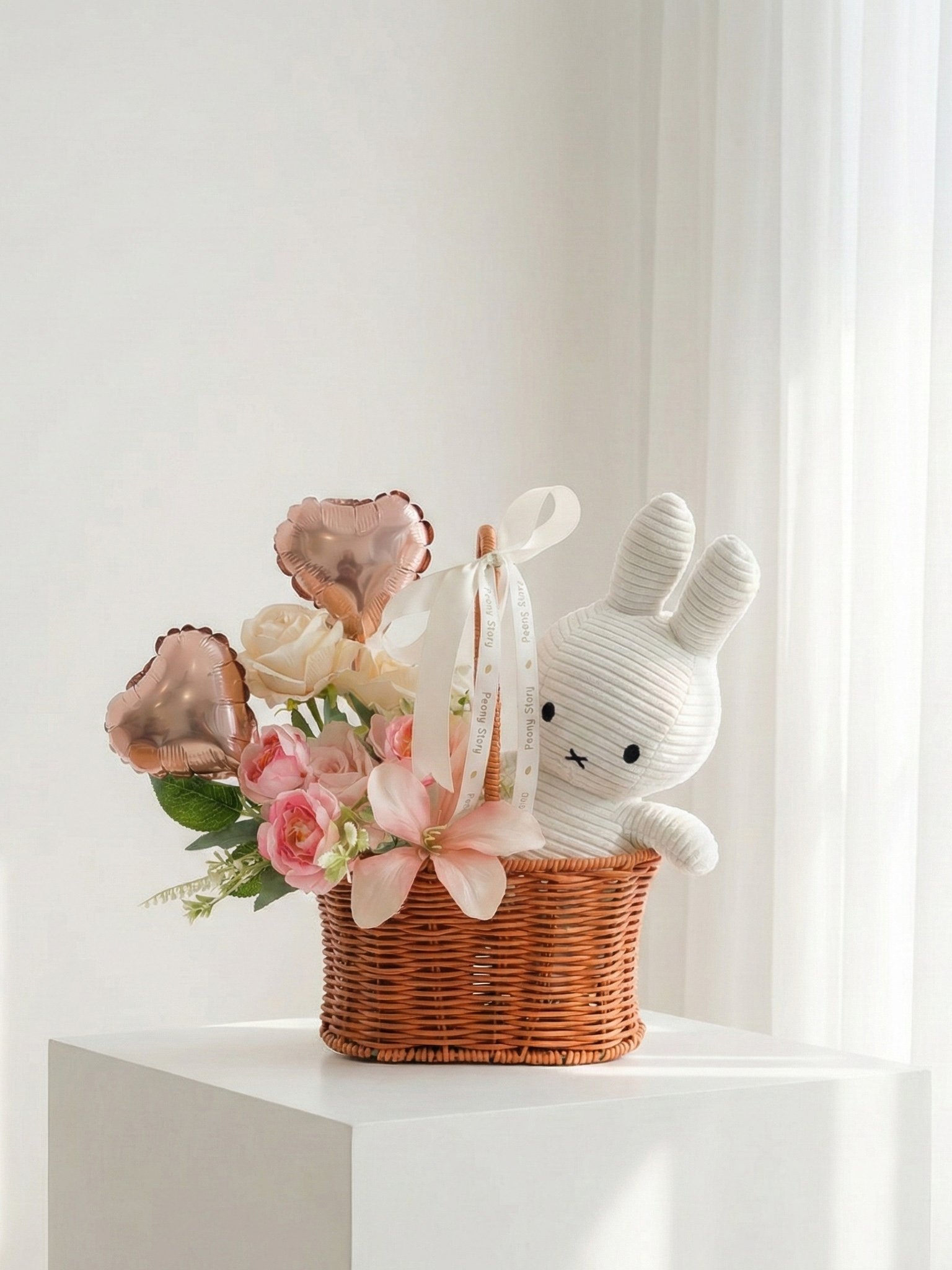 • Bunny Basket berisi bunga imitasi: mawar 3 tangkai, baby rose 3 tangkai, amarylis 1 kuntum, hydrangea, boneka kelinci, balon foil hati 2pcs