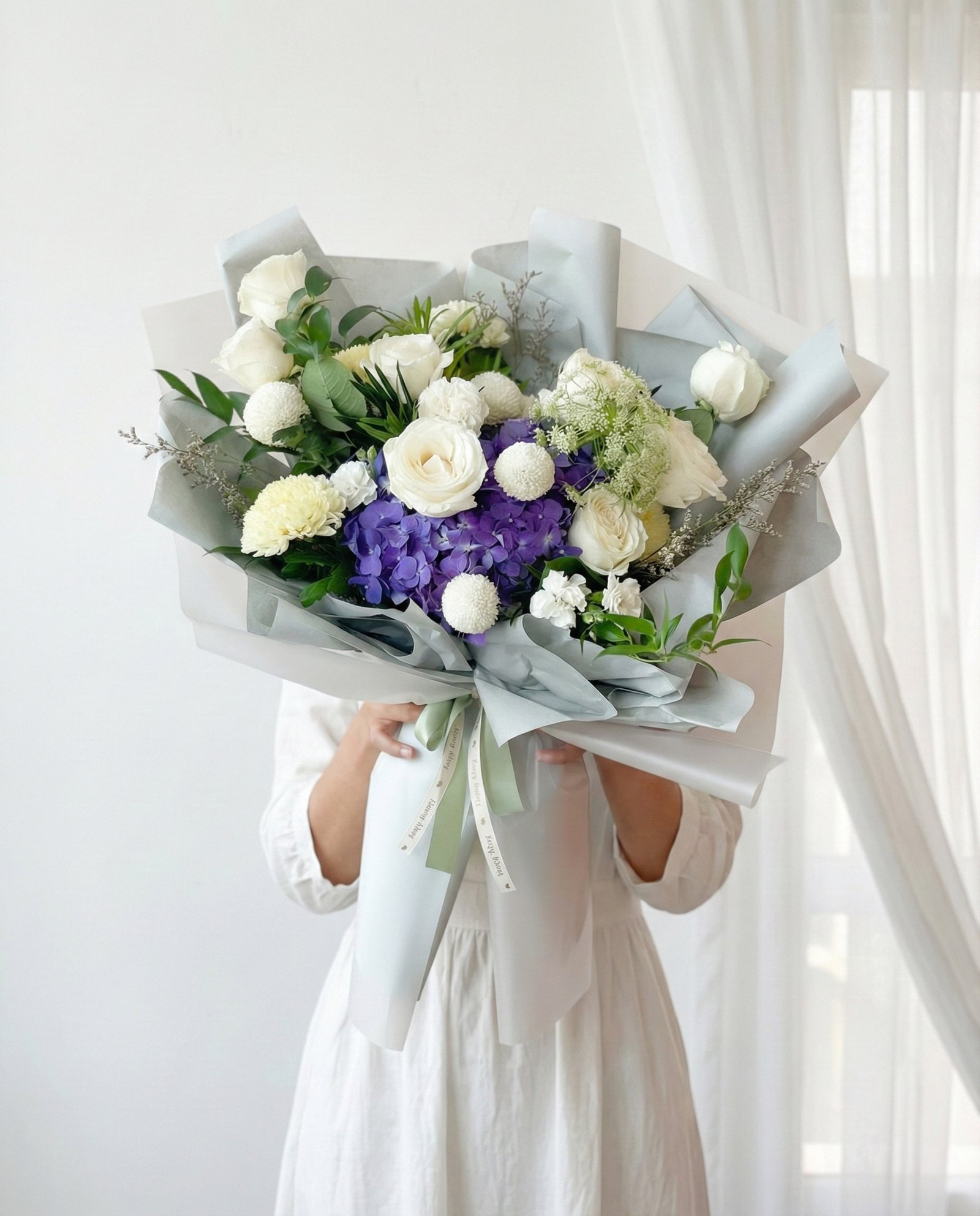 Fiona Bouquet berisi: 10 tangkai mawar, 1 tangkai hydrangea, 3 tangkai gladiol, 5 tangkai pompom, bunga dan daun pelengkap