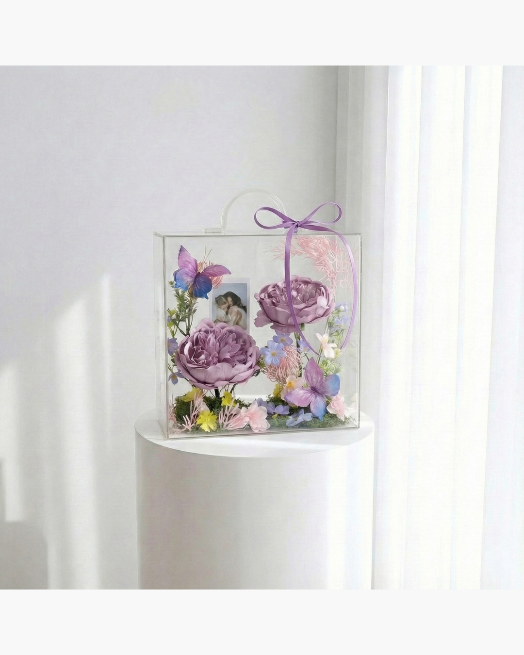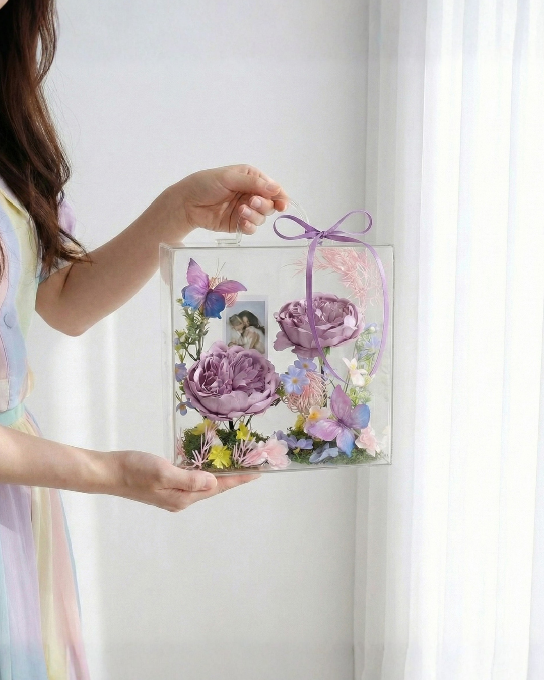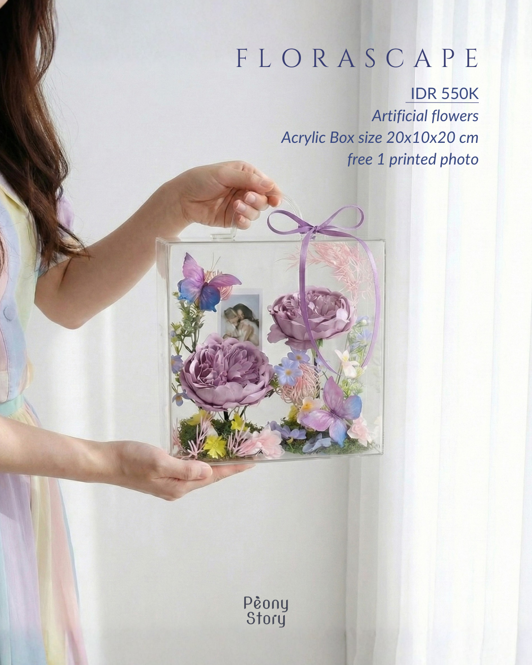 Rangkaian bunga eksklusif yang dikurasi dalam kotak akrilik premium (crystal clear). Desain modern dan compact (20x10x20 cm) yang dirancang untuk menjadi centerpiece manis di meja kerja atau sudut favorit rumah Anda.