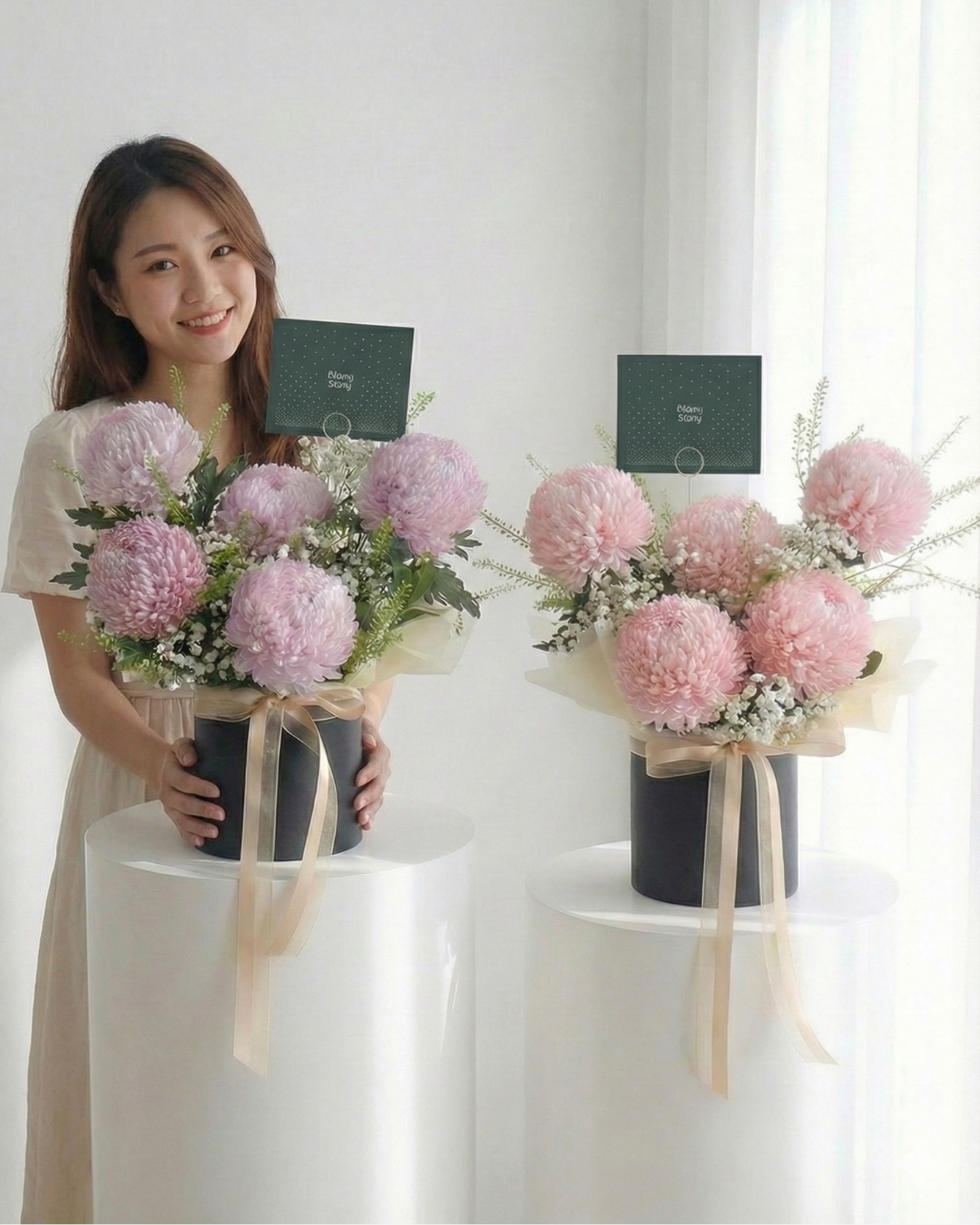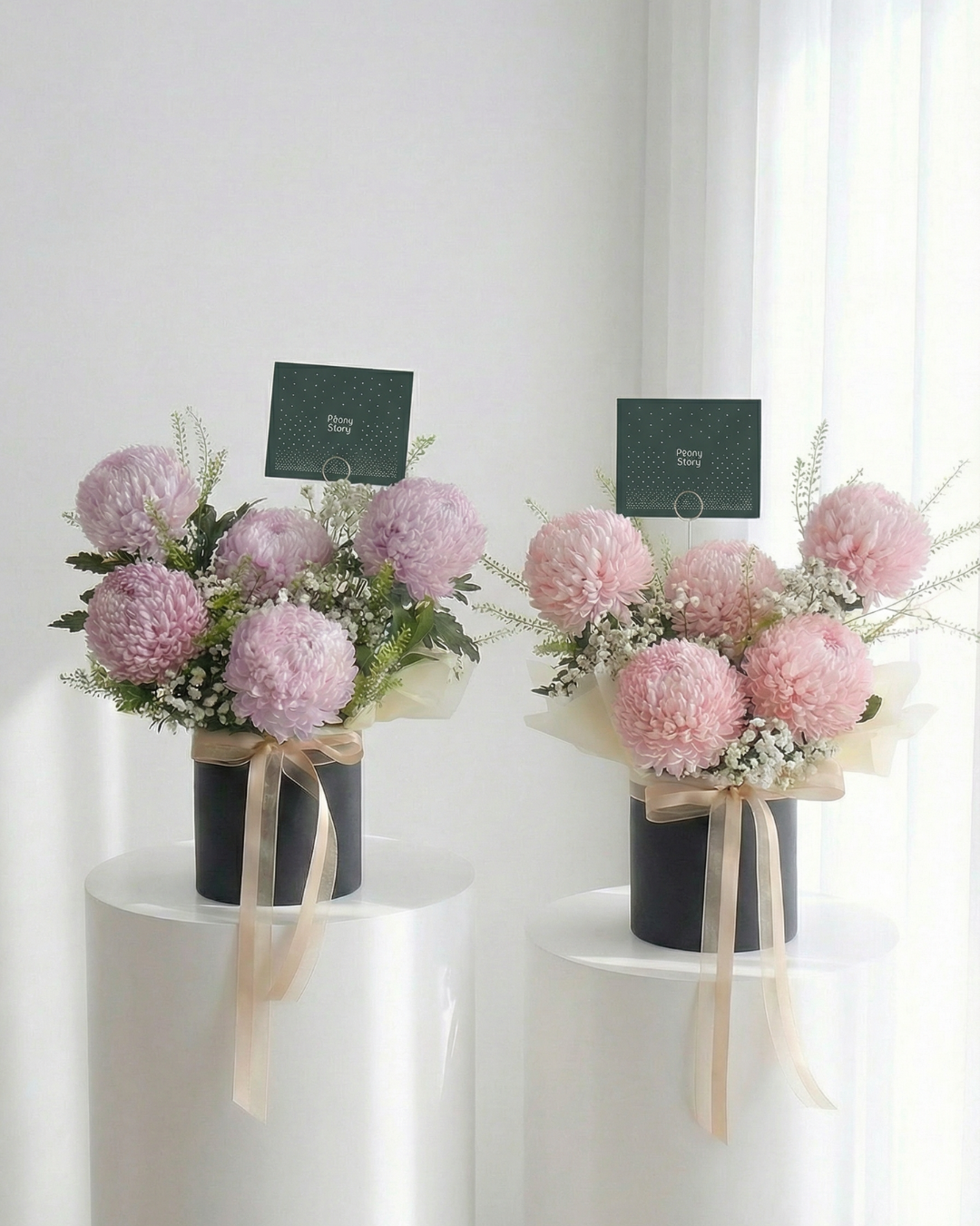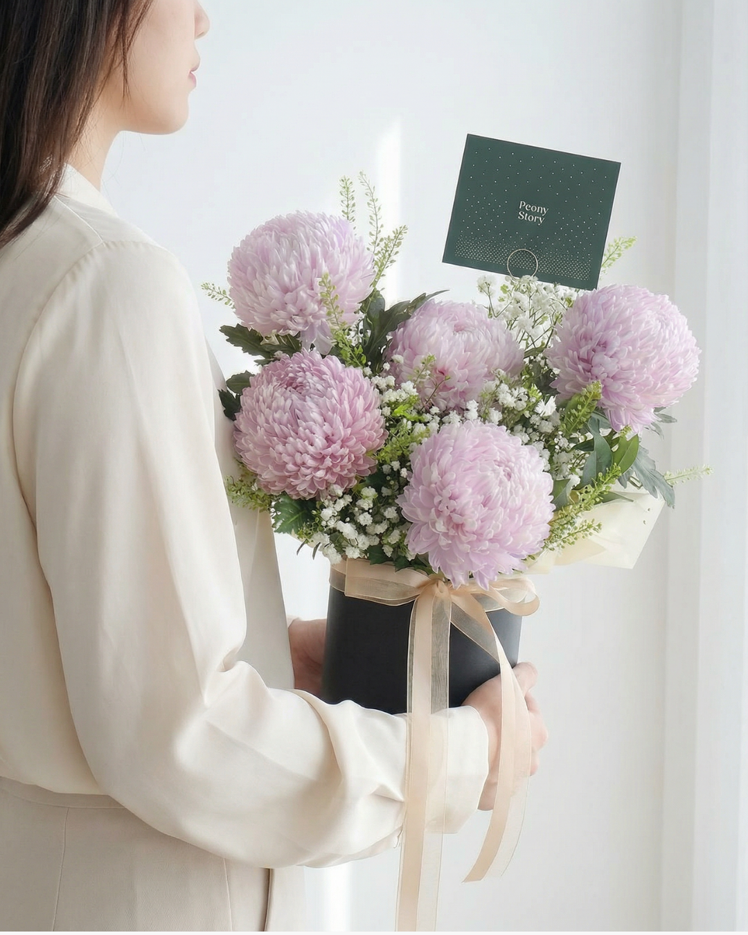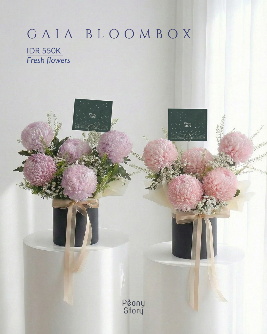 Gaia bloombox berisi 5 tangkai bunga Peony Mum dengan bunga filler dan daun.