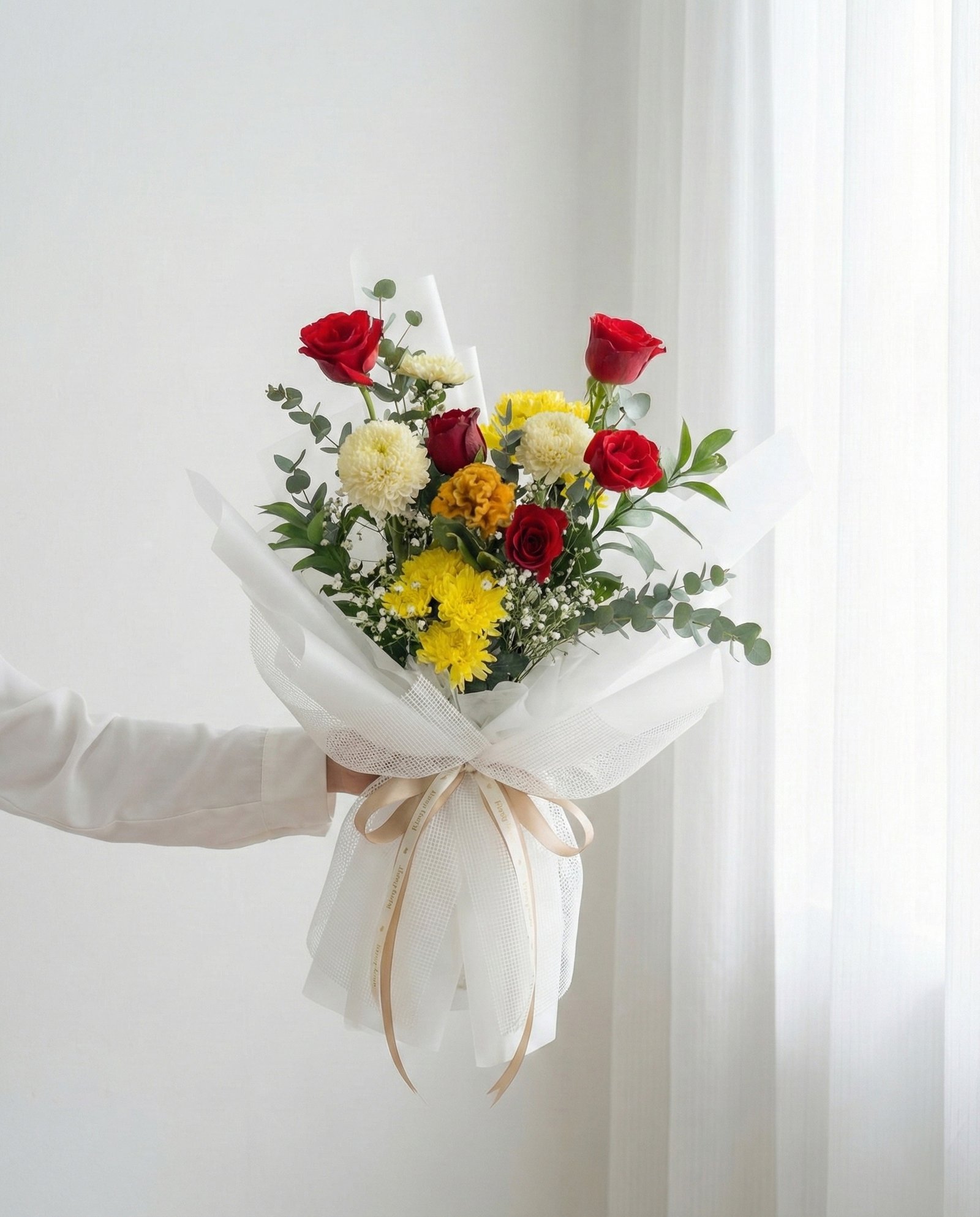 Popular Bouquet termasuk: Mawar 5 tangkai, Gerbera 2 tangkai, Gompie/Pompom 3 tangkai, bunga dan daun pelengkap