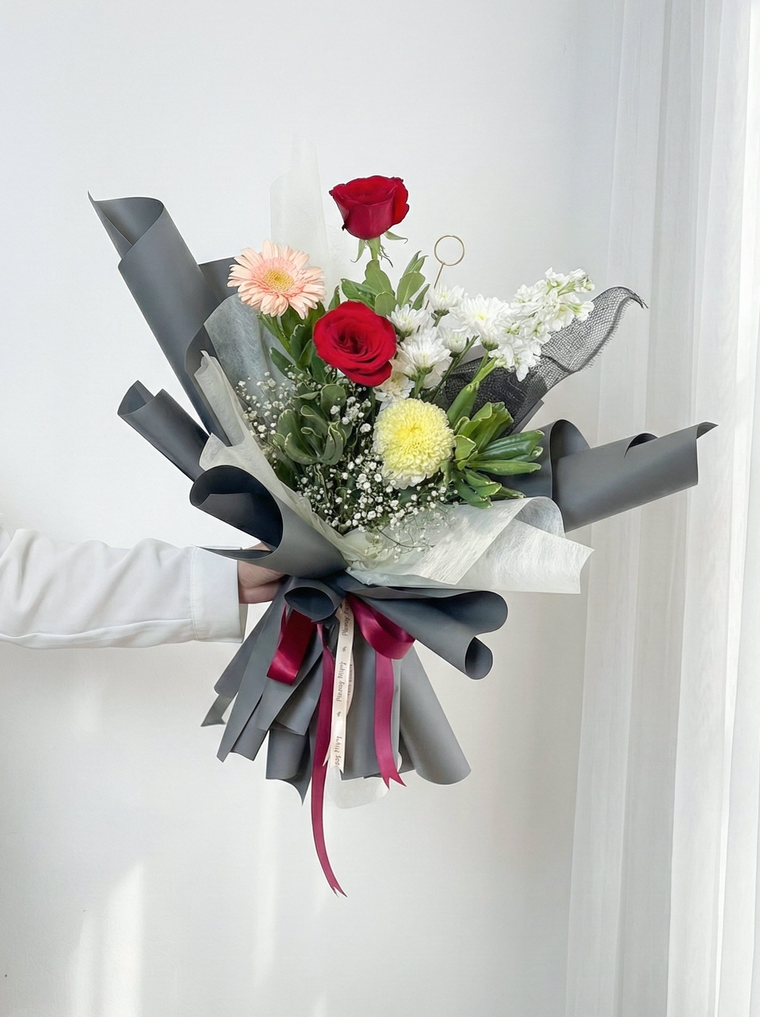• Jenis Bunga: 2 tangkai mawar, 1 tangkai gompie, 1 tangkai gerbera, 2 tangkai aster, bunga dan daun pelengkap