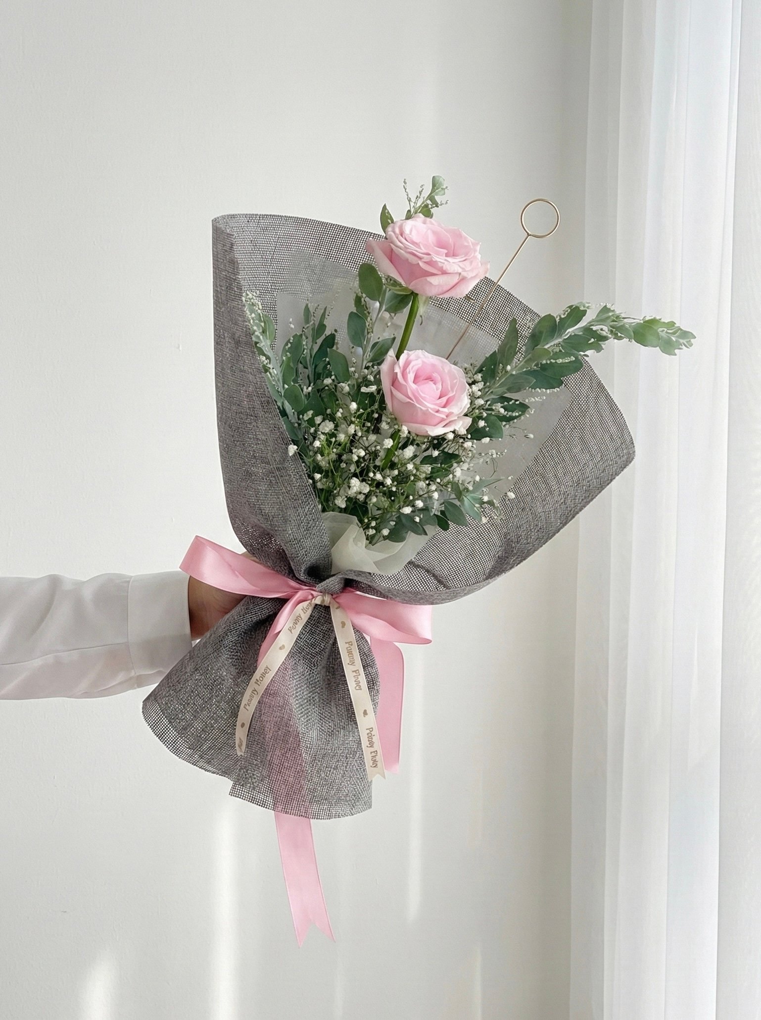 Twin Roses berisi:2 tangkai mawar, filler dan daun pelengkap diwrap dengan kain jute
