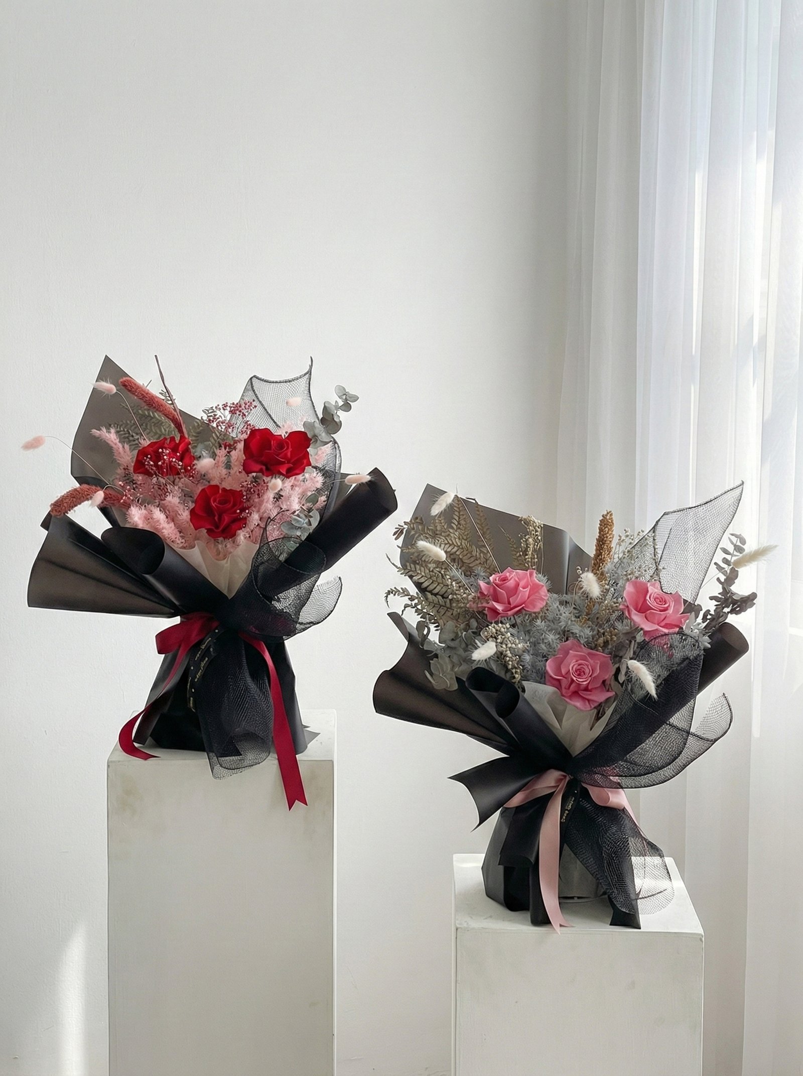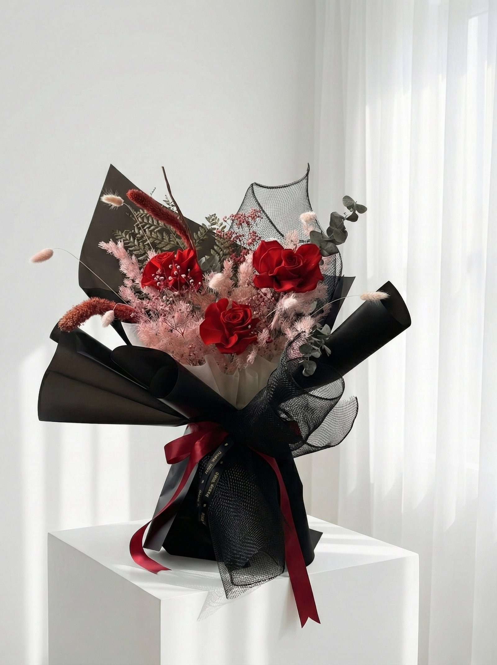 Bouquet ini terdiri dari 3 tangkai mawar preserved (mawar asli yang telah melalui proses pengawetan) sehingga daoaat disimpan dalam jangka waktu yang lama.