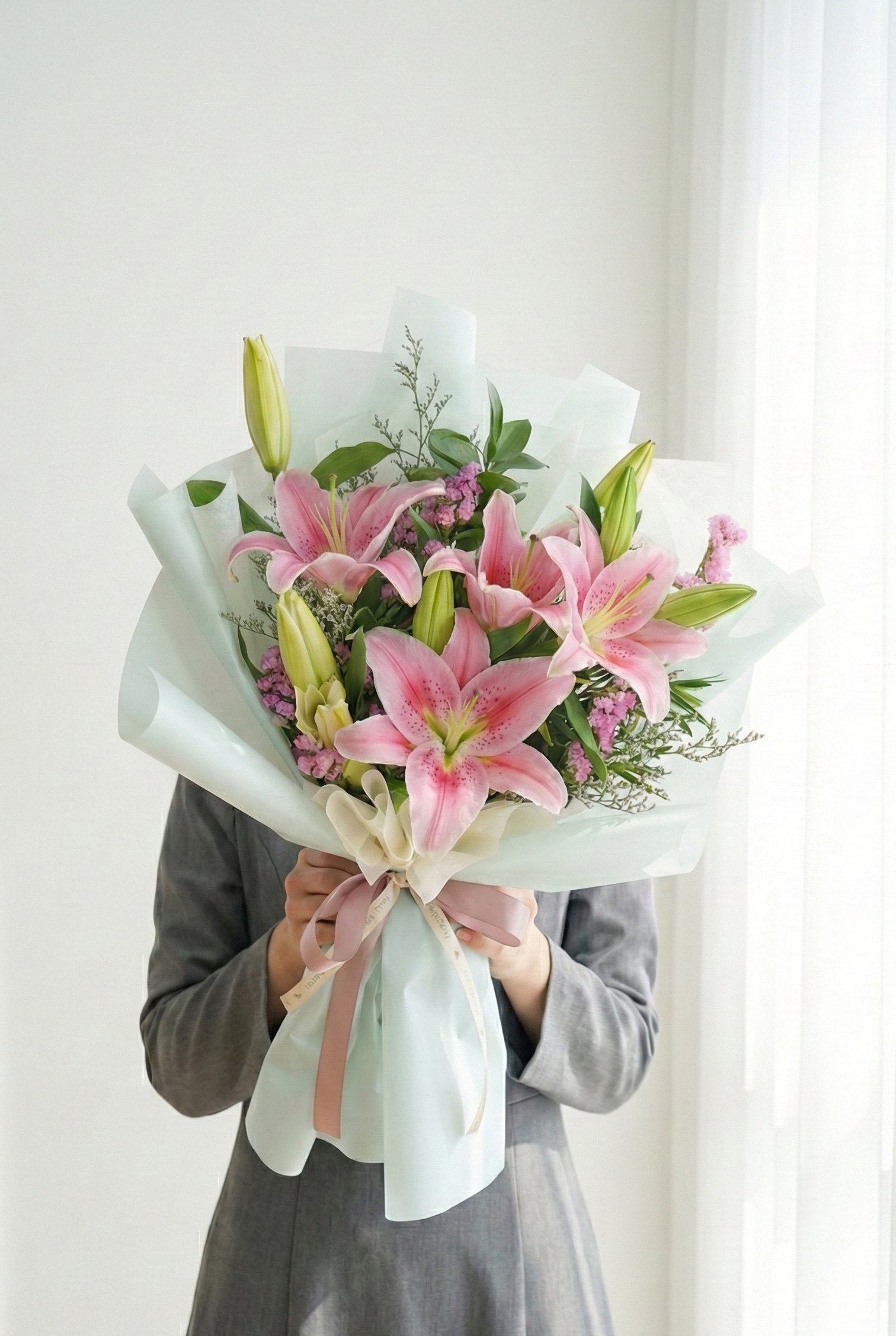 Double Lilies Bouquet termasuk: 2 tangkai lily dan filler